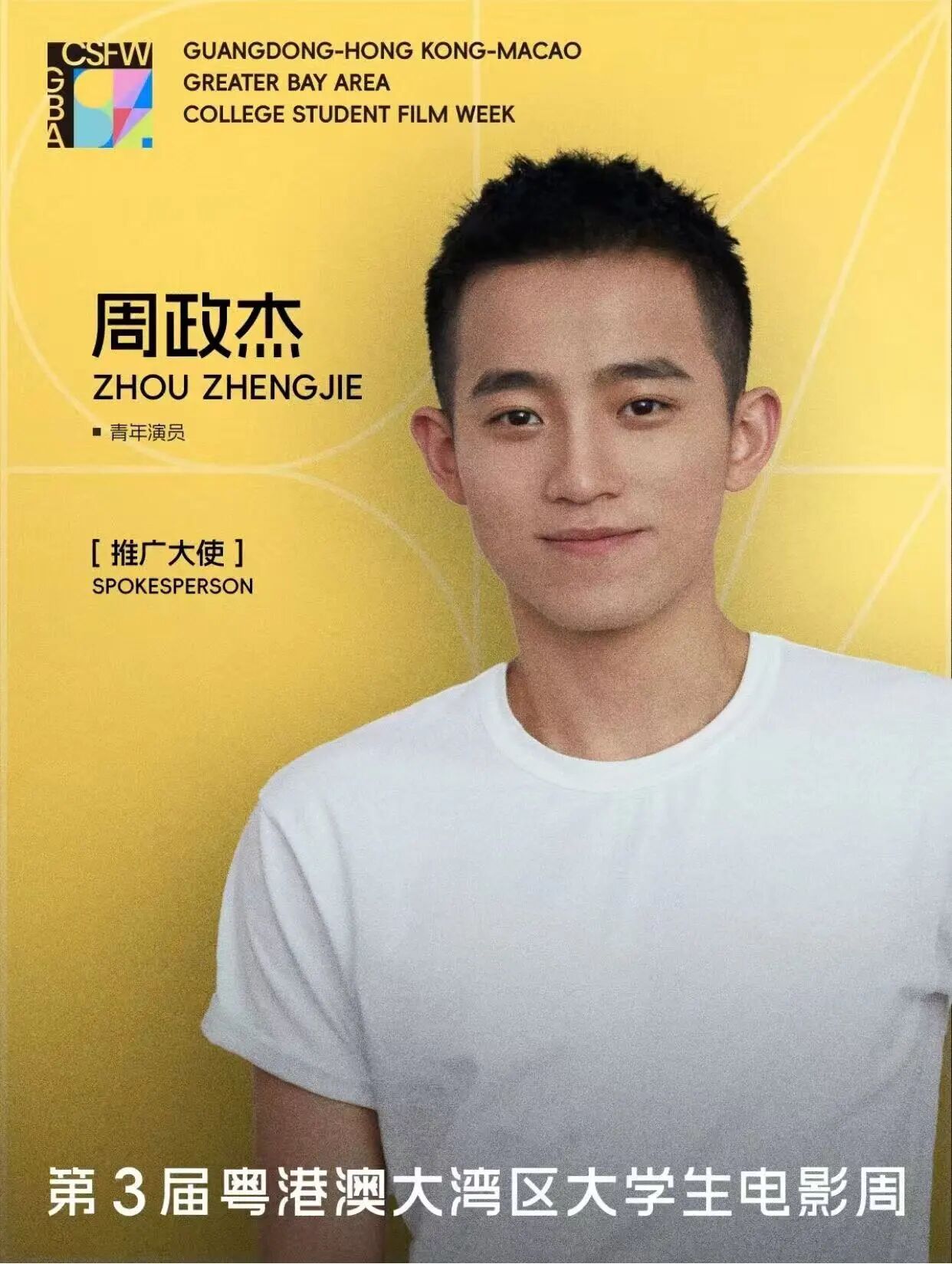 凭借《志愿军:浴血和平》《捕风追影》《震耳欲聋》《蛟龙行动》等多部电影作品受到观众喜爱的青年演员周政杰,受邀担任第3届粤港澳大湾区大学生电影周暨第21届广州大学生电影展的推广大使。